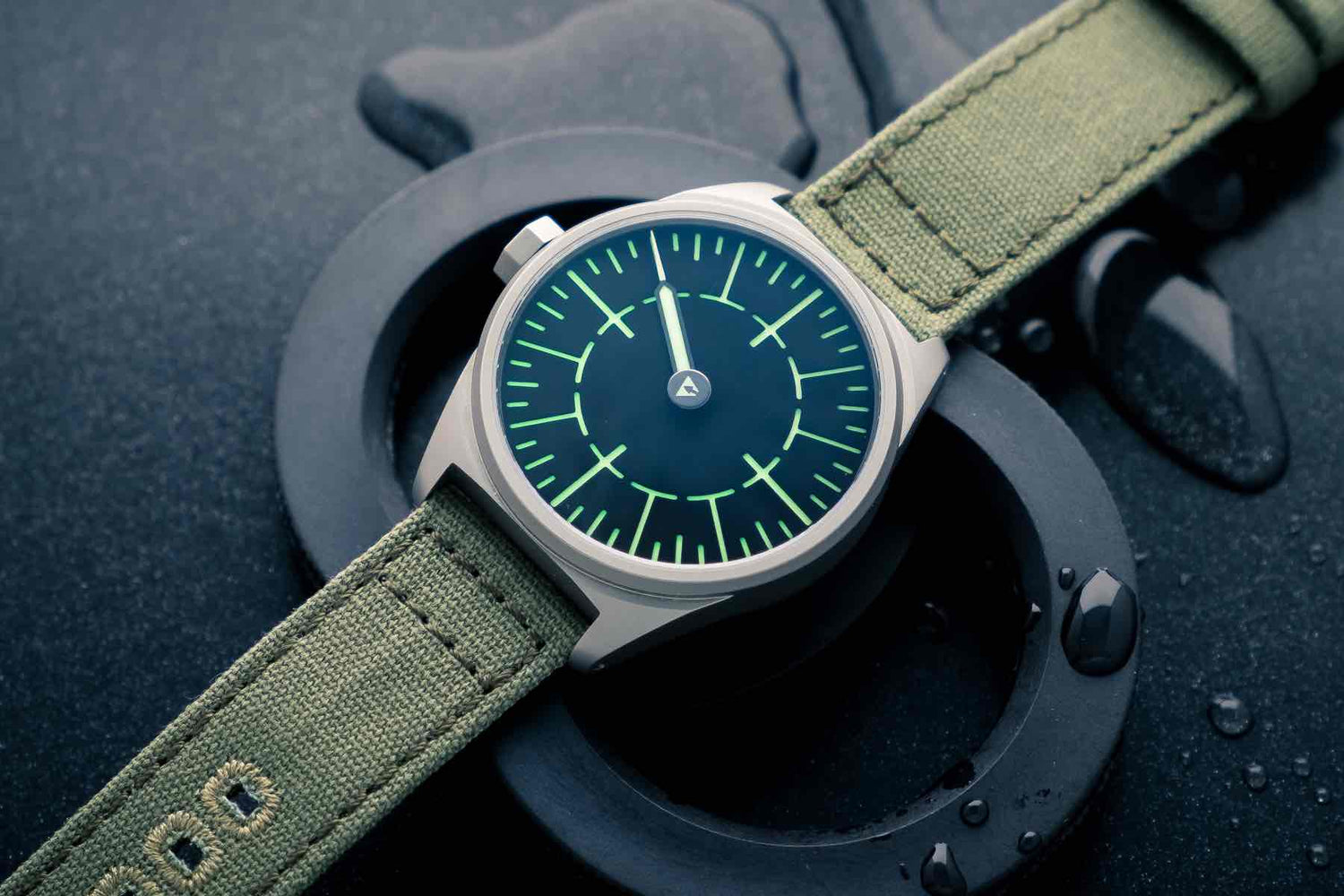 The 2017 project is called "Ace", a robust 42mm instrumental aviator watch made of grade 5 titanium and a sandwich dial that offers maximum legibility day and night. The heavily modified and revised Swiss Made hand-wound movement (ref. ETA 6497) with swan neck Regulator